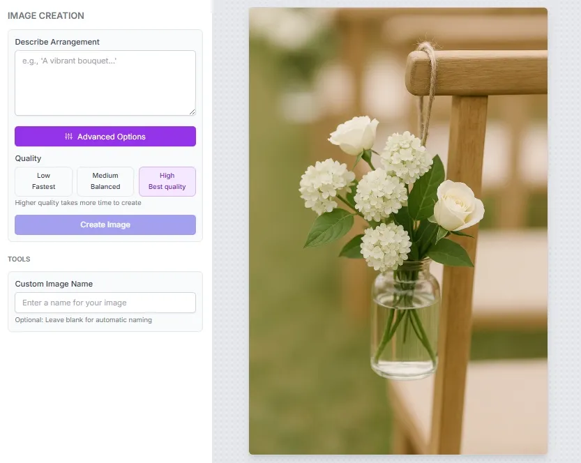 FloraViz helps wedding florists, event designers, and boutique studios turn a client's vision into a floral mockup in seconds. Instead of spending hours sketching or sourcing Pinterest boards, you describe the arrangement and get a realistic preview you can drop straight into a proposal — so clients see exactly what they're booking.