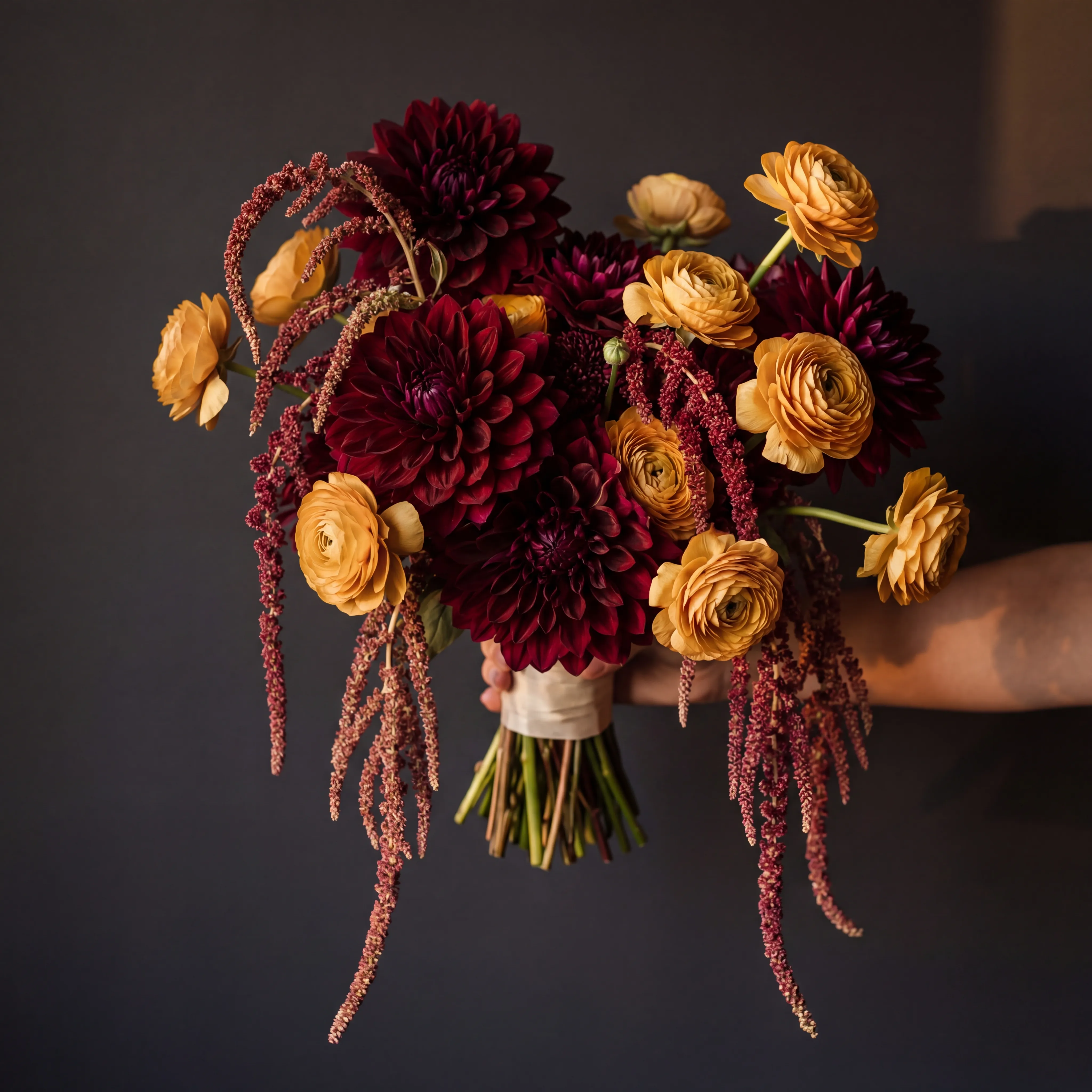 Hand-tied, cascading, nosegay, garden-style. Name the flowers, pick the colors, and set the mood. FloraViz handles the rest. Works for bridal bouquets, bridesmaid bouquets, and toss bouquets alike.