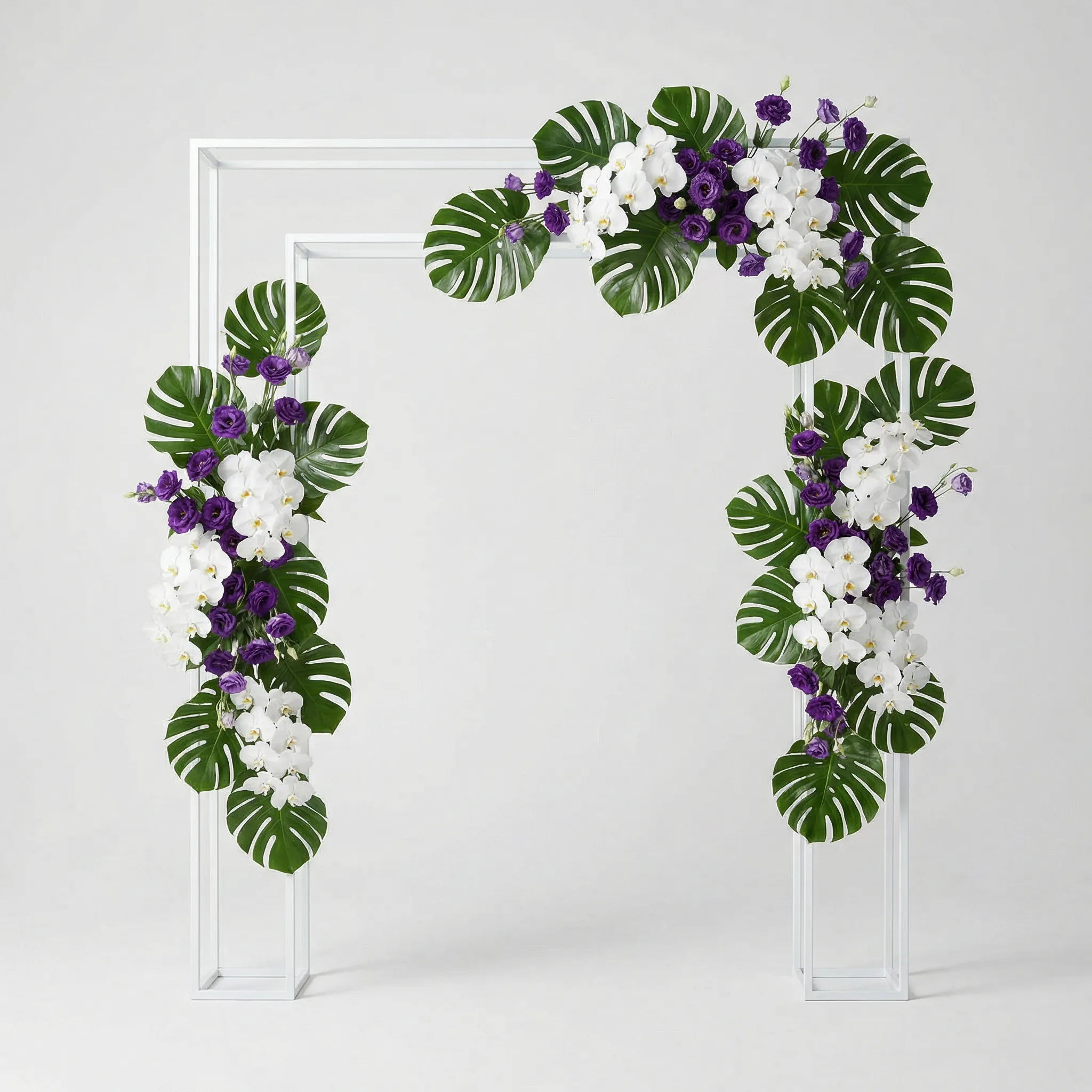 Present two to three ceremony arch mockups at different floral coverage levels. Show a full-coverage version, a half-coverage version, and a corner-accent version. Place the price next to each so clients make a budget decision based on what they see.
