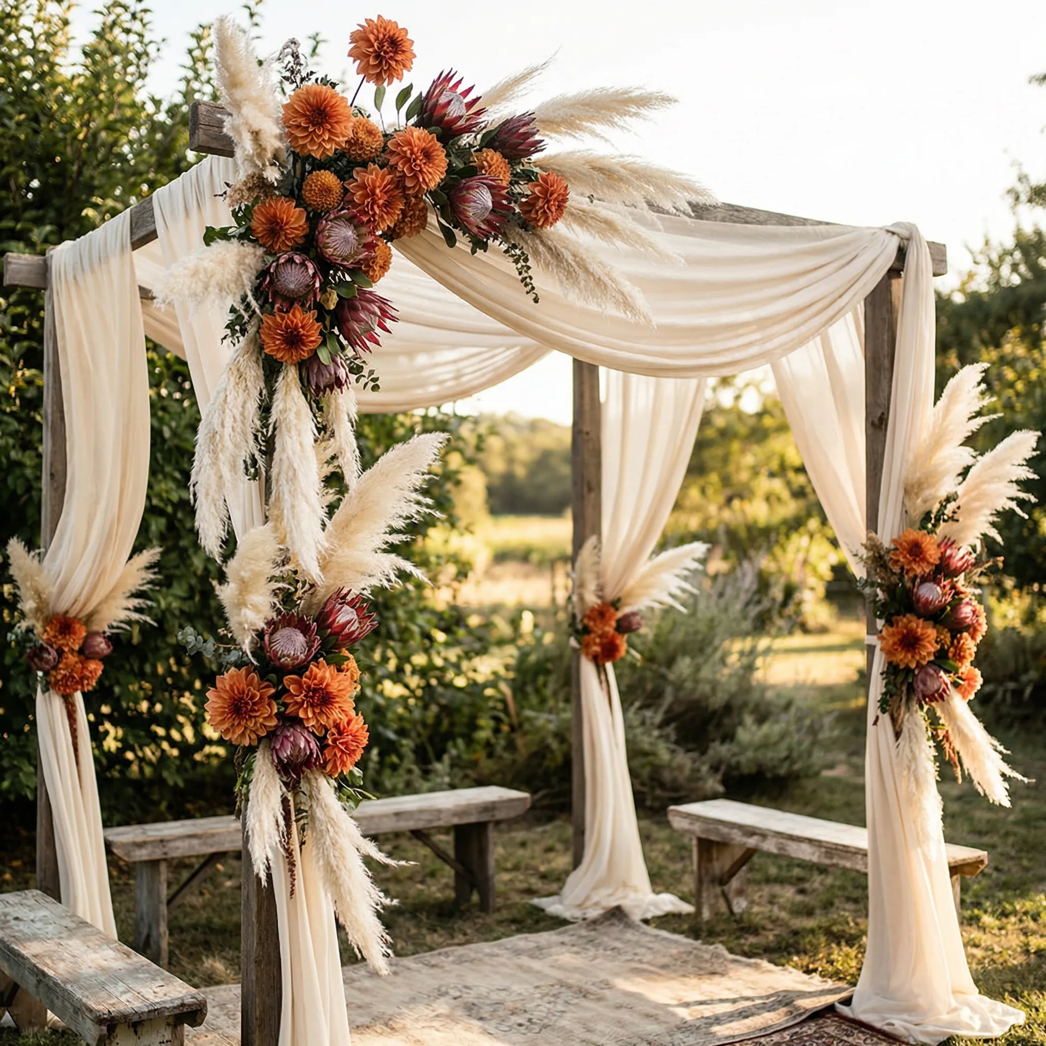 Create ceremony arch mockups showing scale, shape, and floral coverage. Describe the arch and flowers, then get a realistic visual in seconds. Try free.