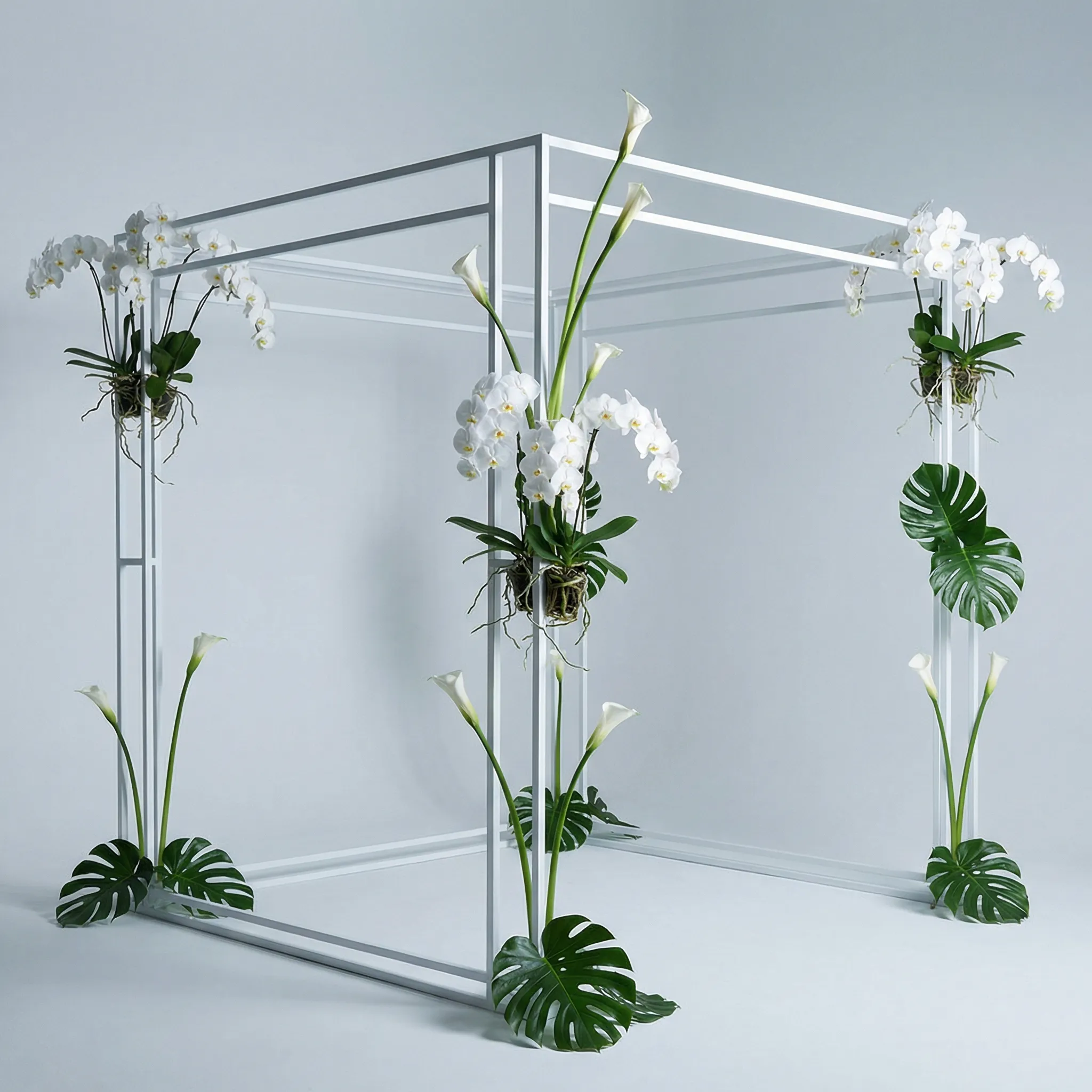 Corner clusters, full garland wraps, cascading greenery, or minimal single-bloom accents. Name the flowers, set the palette, and describe how you want them placed on the posts and canopy. FloraViz handles the rest.