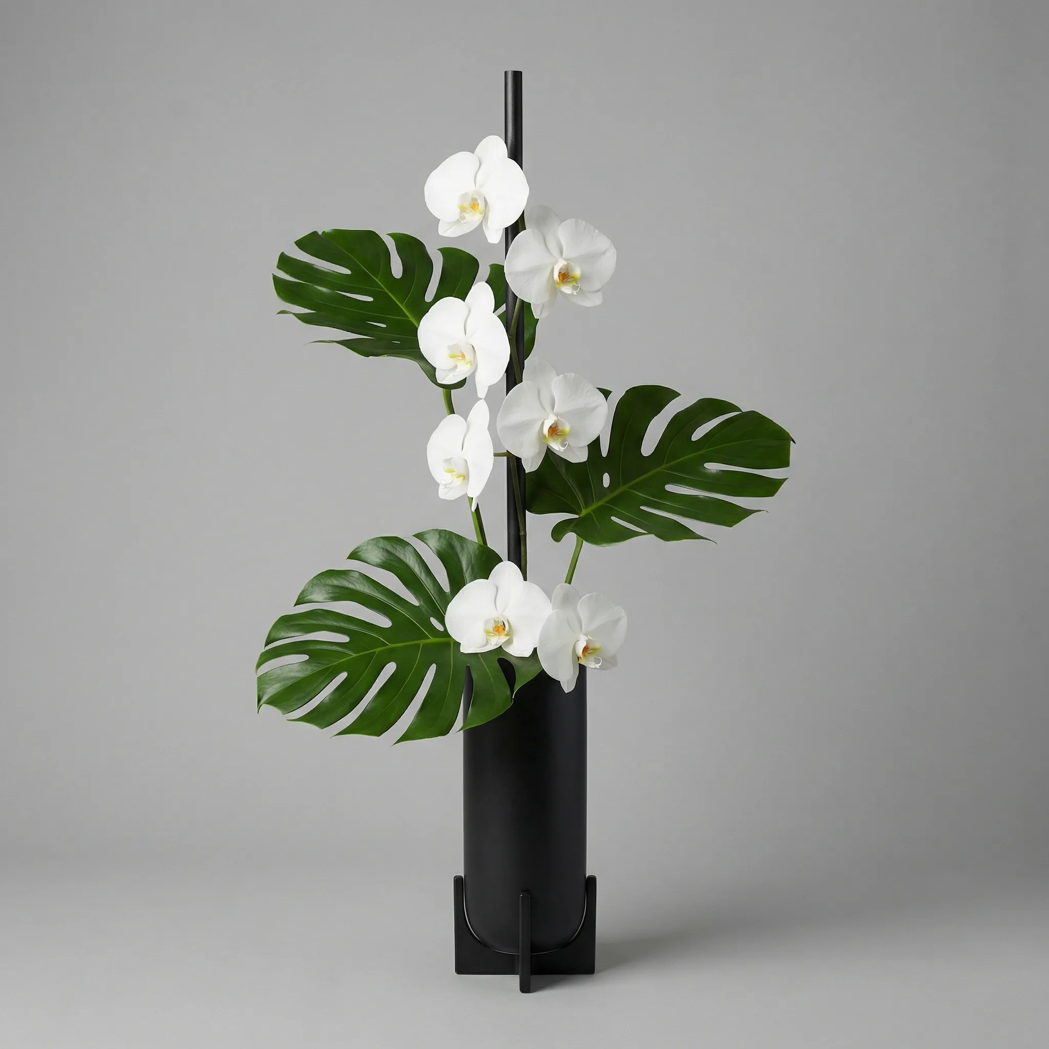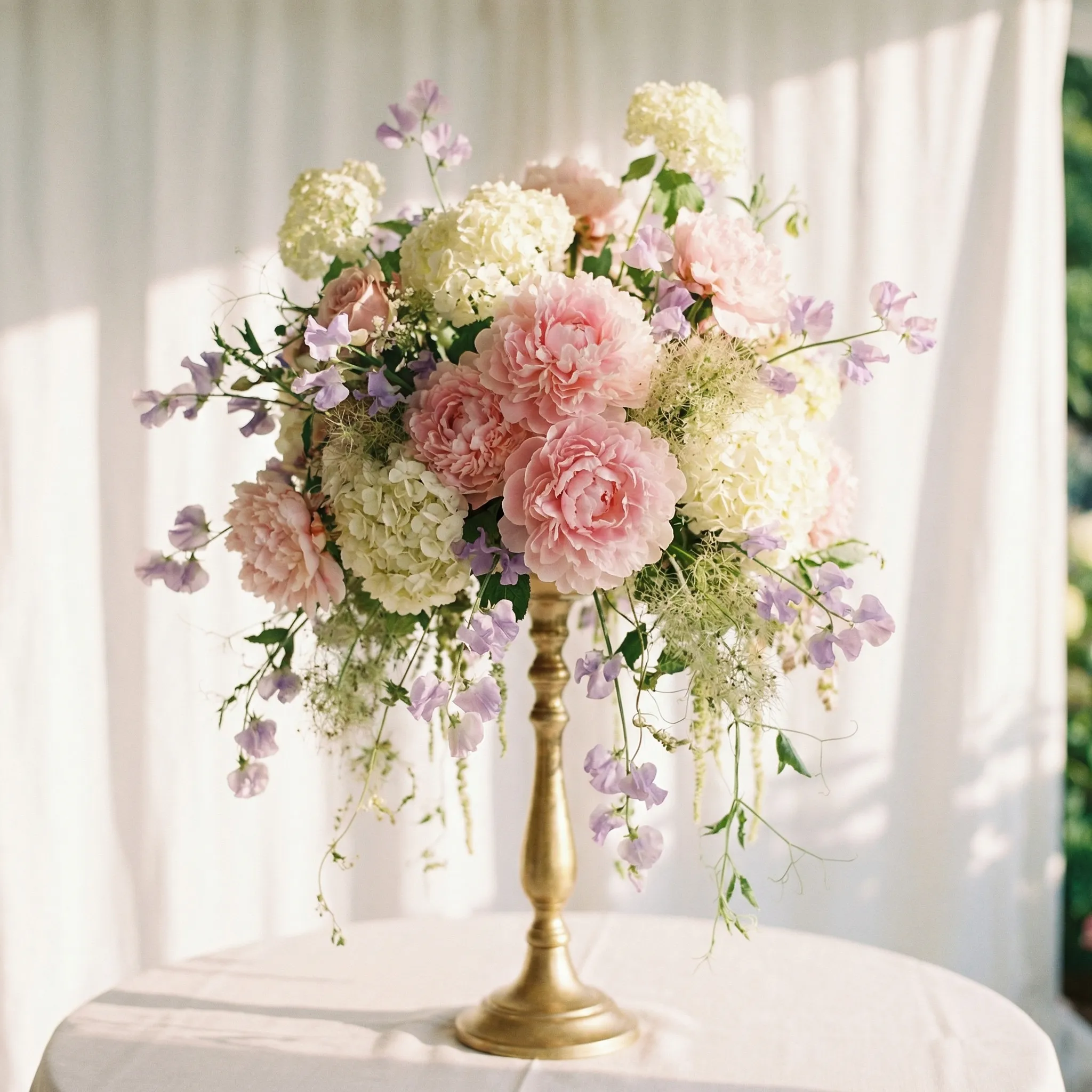 Tall centerpieces live or die on proportions. Describe the stand height, arrangement width, and trailing elements. FloraViz renders the full piece so clients see how the design fills the vertical space above the table.